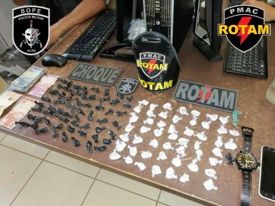 Em patrulhamento de rotina, homens do Batalhão de Operações Especiais (Bope) prenderam um suspeito de tráfico de drogas na rua Campo Novo, no bairro Ayrton Senna, em Rio Branco.