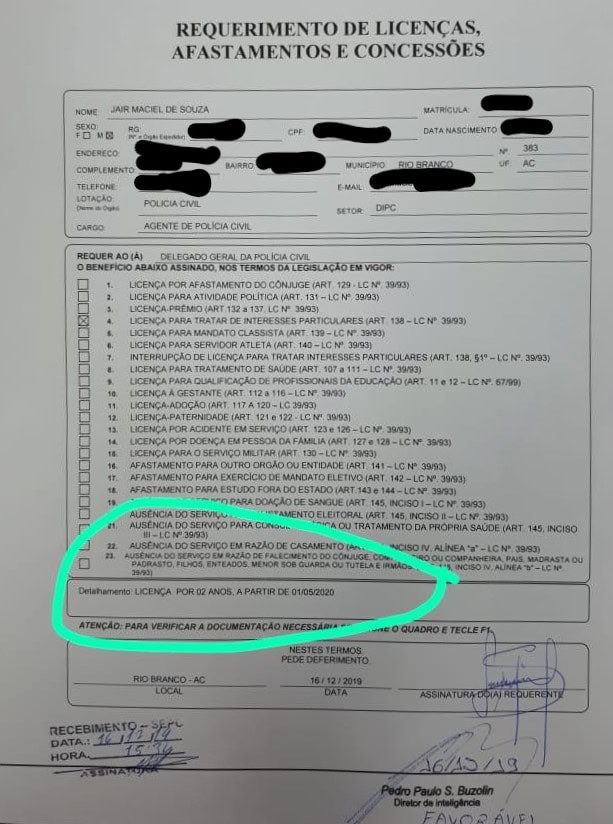 O agente de polícia civil Jair Maciel de Souza, servidor público que decidiu se afastar do trabalho, usou as licenças que tinha direito e em seguida, ainda no final do ano passado, entrou com um pedido de afastamento sem ônus, como permite a lei a partir de 1º maio de 2020. O pedido foi autorizado pelo delegado Pedro Paulo Buzolin, diretor geral do Departamento de Inteligência da Polícia Civil, órgão de lotação de Jair. Ocorre que mesmo o pedido sendo feito com cinco meses de antecedência, a Polícia Civil não deu continuidade ao pedido de afastamento dentro da área administrativa.