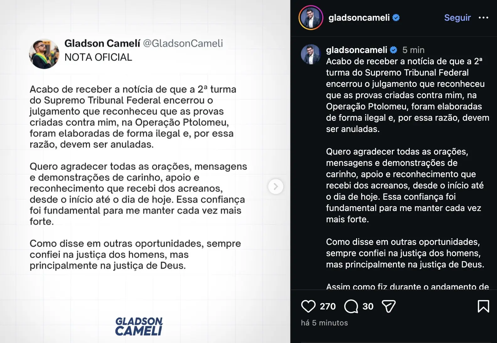 Gladson diz que decisão do STF reforça sua confiança na justiça: “ fundamental”