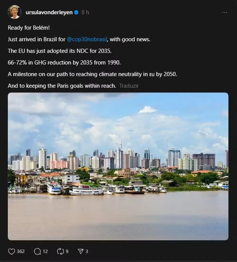 Presidente da Comissão Europeia chega a Belém e anuncia nova meta de redução de emissões de gases 06/11/2025 6:51