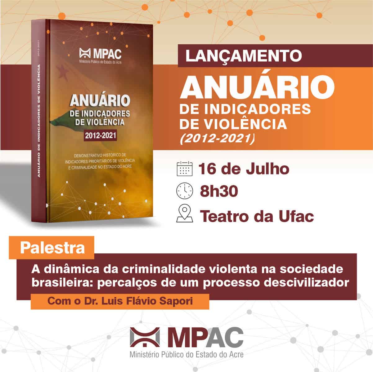 O Ministério Público do Estado do Acre (MPAC) lançará, no próximo sábado, 16, a partir das 08h30, no Teatro da Universidade Federal do Acre (Ufac), os dados consolidados do Anuário de Indicadores de Violência no Acre referente ao período de 2012 a 2021. A publicação foi produzida pelo Observatório de Análise Criminal, setor que integra o Núcleo de Apoio Técnico (NAT), órgão auxiliar do MPAC.
