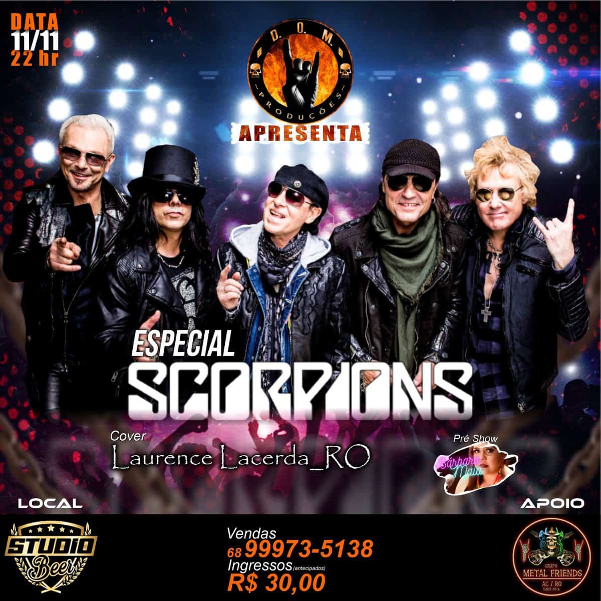 Diretamente de Porto Velho, o cantor Laurence Lacerda chega a Rio Branco para o Especial da banda alemã Scorpions, nesta sexta-feira, 11, às 22 horas, no Studio Beer, com pré-show de Bárbara Maia.