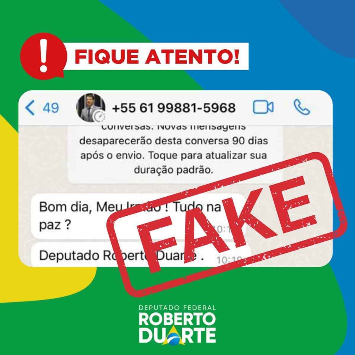 Alertamos a população de que estão utilizando um número de WhatsApp falso do deputado federal Roberto Duarte para entrar em contato e tentar aplicar golpes.