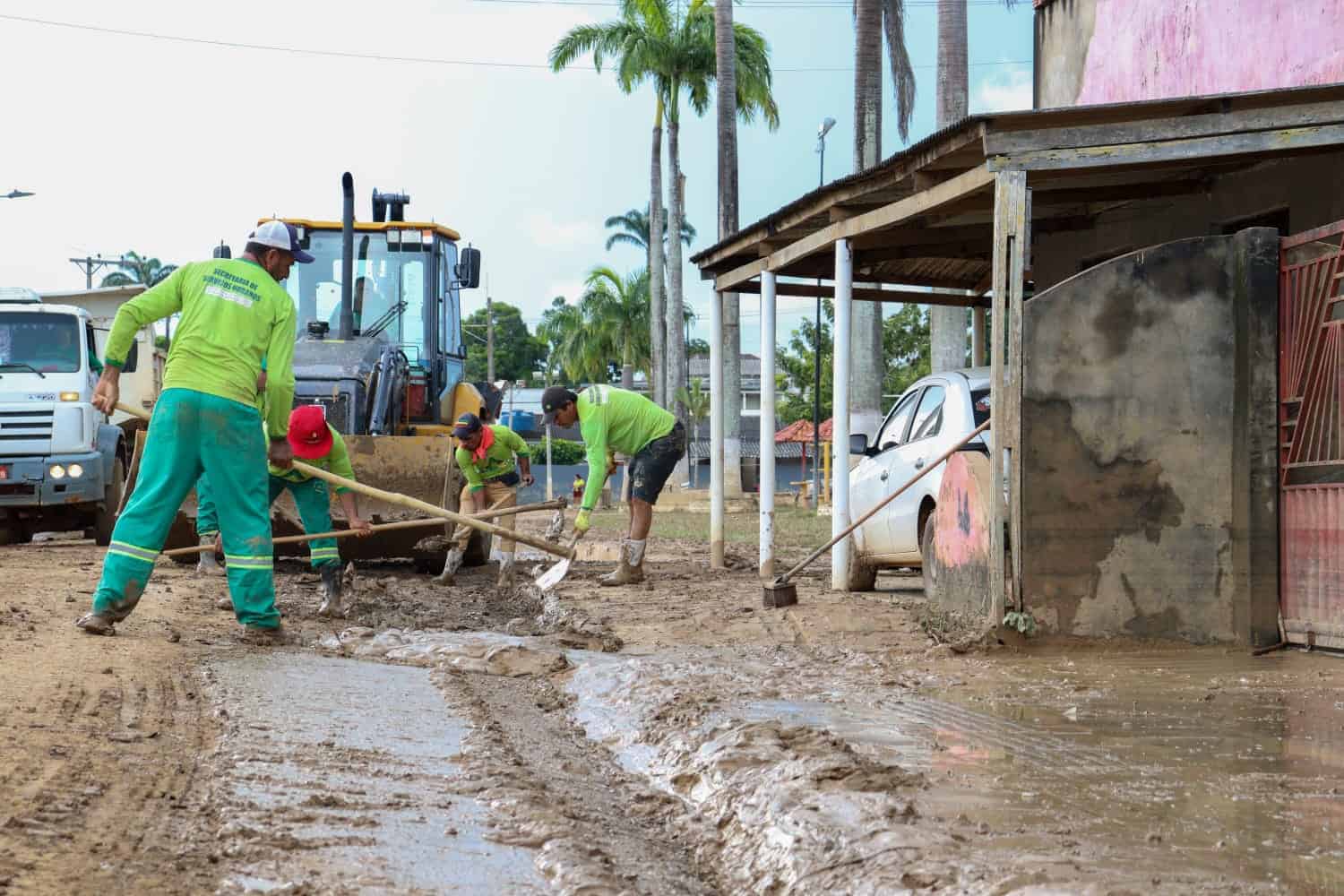 A equipe da Secretaria de Obras tem se revezado para realizar o serviço de limpeza, retirada de lixos, entulhos e lavagem das ruas, que ficaram totalmente cobertas por lama, dando lugar à poeira, com o passar dos dias.