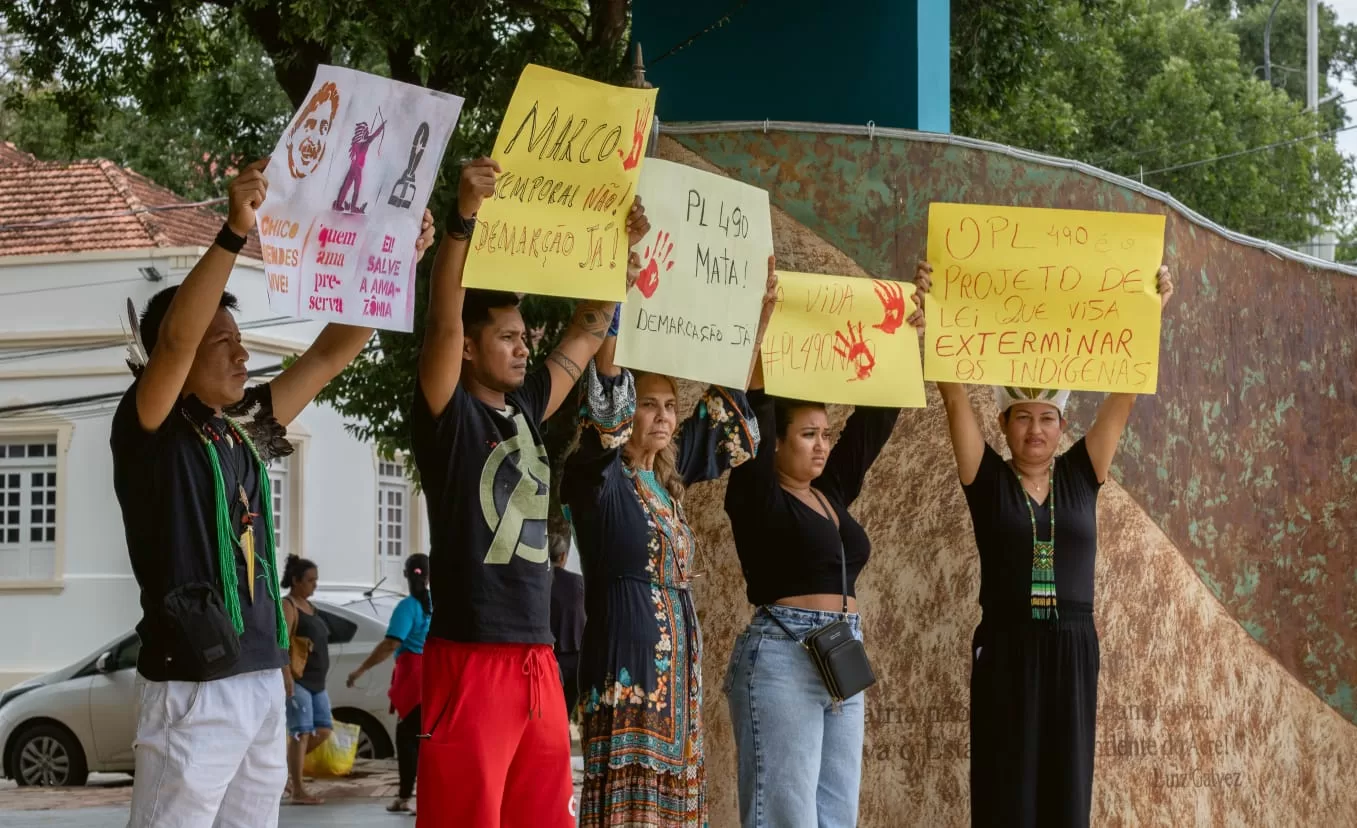 Como parte da luta nacional convocada pela Coordenação das Organizações Indígenas da Amazônia Brasileira (Coiab) e Articulação dos Povos Indígenas do Brasil (Apib), os povos originários do Acre protestam nesta quarta-feira, 07, no saguão da Assembleia Legislativa do Acre (Aleac), contra o Marco Temporal, que está em trâmite no Congresso Nacional e no Judiciário.