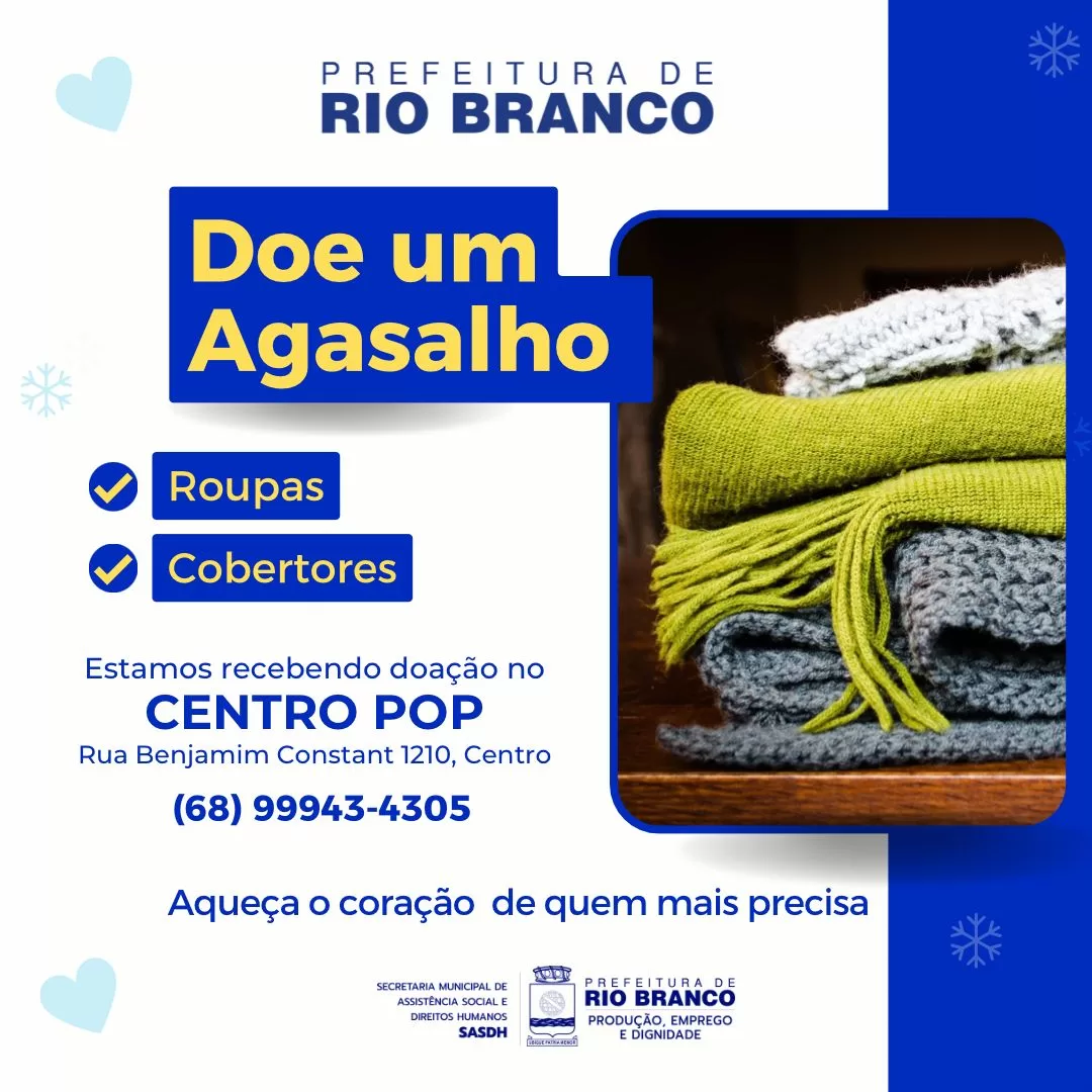 Responsável pelo acolhimento das pessoas em situação de rua, a prefeitura de Rio Branco iniciou uma campanha de doação de agasalhos. Além de agasalhos, podem ser doados também outros tipos de roupas e agasalhos.
