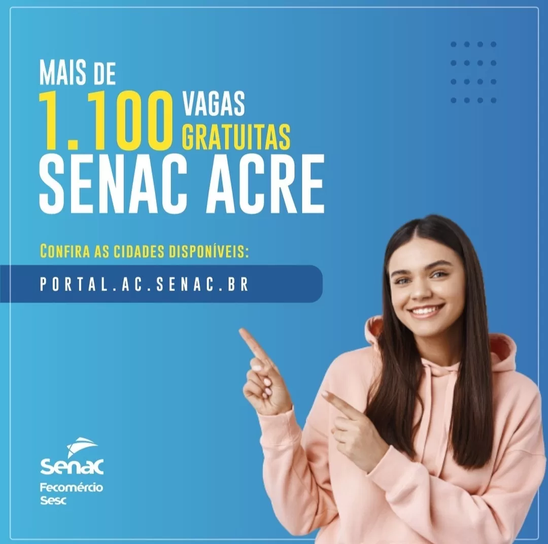 O Senac Acre está com vagas abertas para quem deseja se capacitar e adquirir novos conhecimentos em diversas áreas profissionais. São mais de 1119 oportunidades nas áreas de vendas, montador e reparador de computador, estoquista, cuidador infantil, elaboração de cardápios, gestão, informática, saúde, moda, beleza, entre outras.