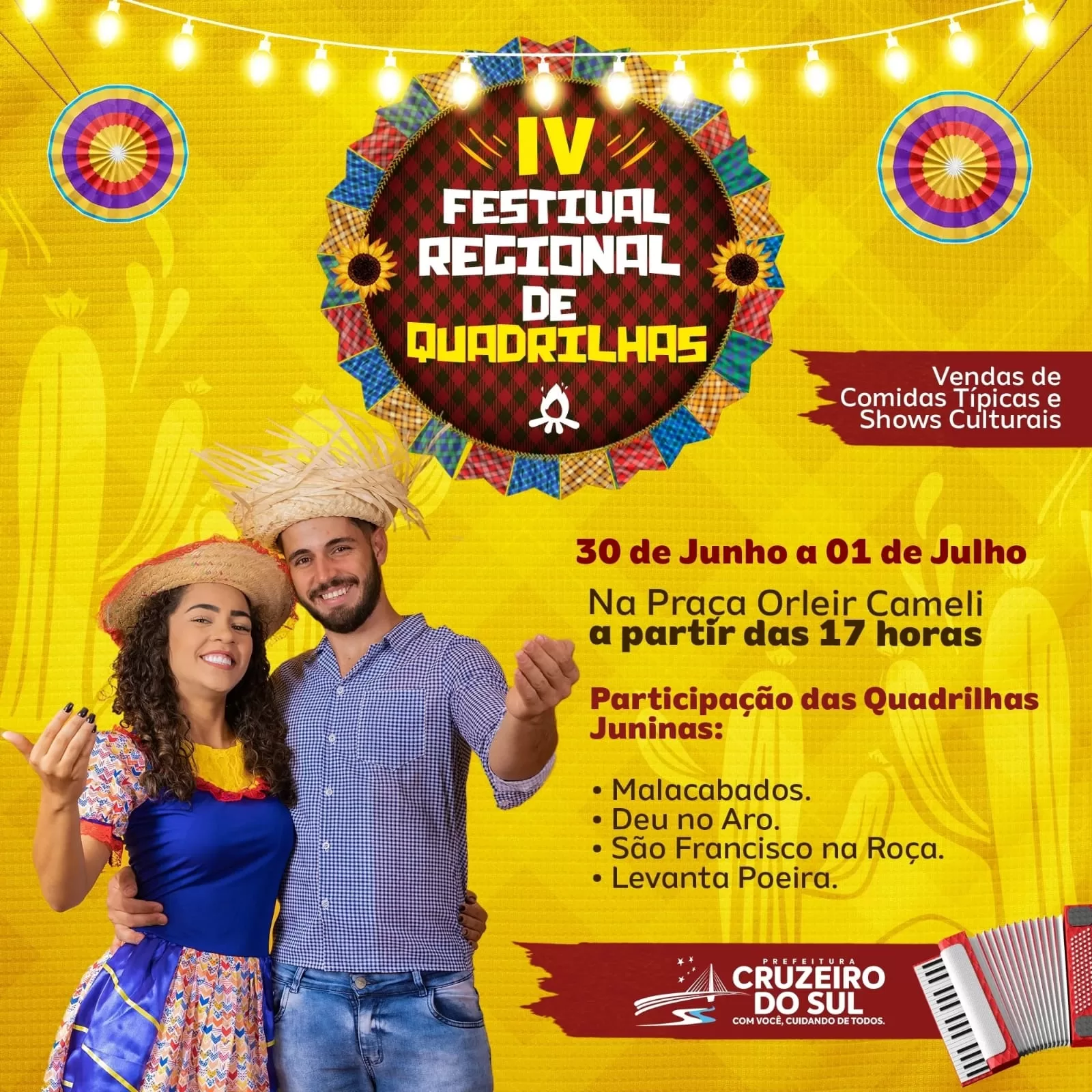 No 4° Festival Regional de Quadrilhas de Cruzeiro do Sul, que acontece nos dias 30 de junho a 01 de julho, na Praça Orleir Cameli, acontecerá a venda de comidas típicas, shows culturais e a escolha da Melhor Junina de Cruzeiro do Sul e da Região.