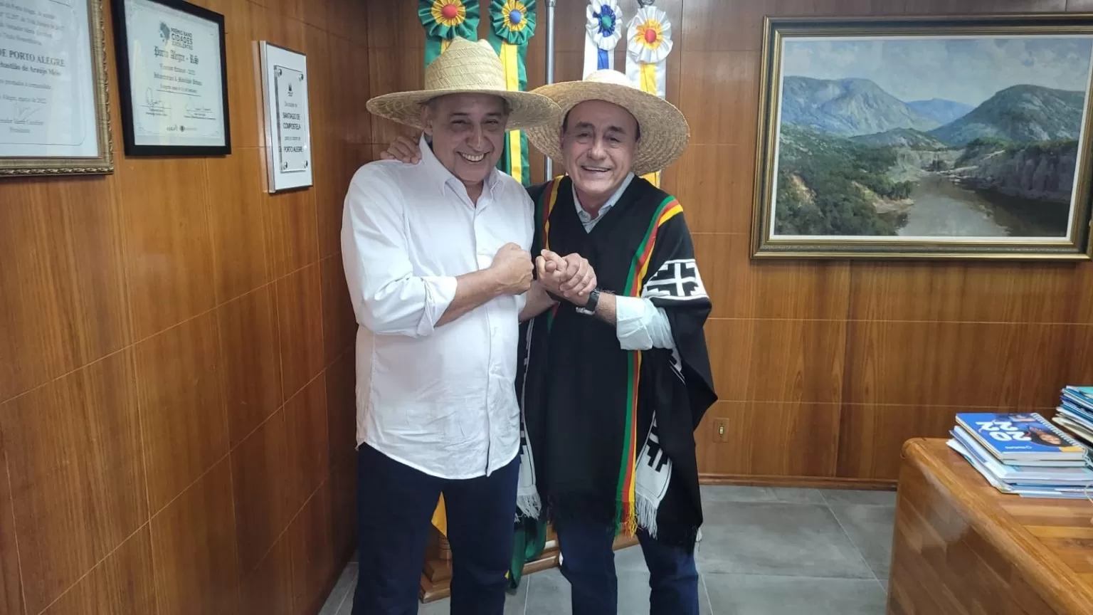 Os dois prefeitos trocaram presentes e Bocalom vestiu trajes tradicionais do Estado. Ele agradeceu a receptividade e convidou o gestor de Porto Alegre para conhecer Rio Branco, em especial o mercado municipal.