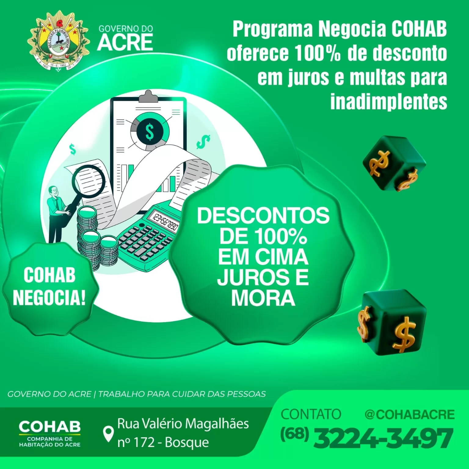 Para auxiliar os cidadãos na regularização de seus imóveis, a Companhia de Habitação do Acre (Cohab) lançou, neste mês de agosto, o Programa Negocia Cohab, que oferece descontos de 100% sobre as taxas de juros, multas e mora acumuladas nas dívidas inadimplentes.