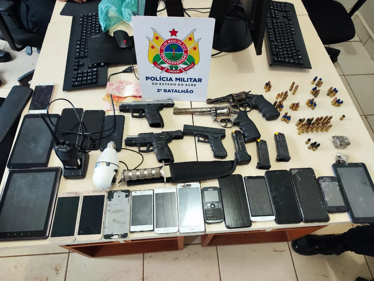 Guarnições do 2º Batalhão da Polícia Militar do Acre (PMAC) apreenderam quatro armas de fogo, mais de 80 munições, celulares, tabletes e drogas, em ocorrência na madrugada desta quarta-feira, 3, na região da Praia do Amapá e bairro Taquari. Três homens foram presos em flagrante, e quatro menores foram apreendidos na operação.