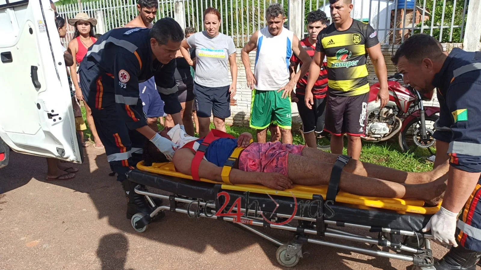 Populares acionaram o Serviço de Atendimento Móvel de Urgência (SAMU) e uma ambulância básica foi acionada. Os Paramédicos prestaram os primeiros atendimentos e em seguida pediram apoio da ambulância de suporte avançado. O paciente foi estabilizado e encaminhado ao Pronto-Socorro de Rio Branco. O Médico do SAMU informou que o paciente estava com um sangramento ativo no ouvido, uma fratura de mandíbula e tendo perda de memória.