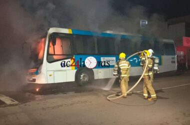 Uma pane elétrica ocasionou um incêndio e destruiu totalmente a parte do motor e a frente de um ônibus da empresa Ricco na noite desta