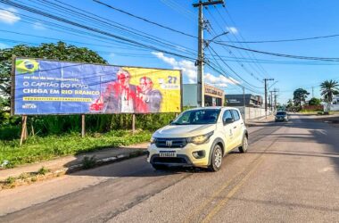 Um outdoor do senador Marcio Bittar, que anuncia a vinda do ex-presidente da República Jair Bolsonaro a Rio Branco, foi manchado com tinta vermelha nos