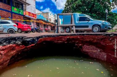 Uma cratera de cerca de dois metros de diâmetro se abriu na rua Arlindo Leal, em frente ao Mercado dos Colonos, no bairro da Base.