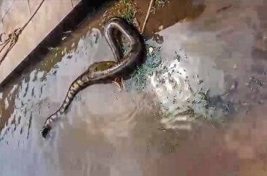 Moradores da Travessa Dez de Junho, na região do bairro Tropical, em Rio Branco, tomaram um susto ao se depararem com uma Sucuri de tamanho