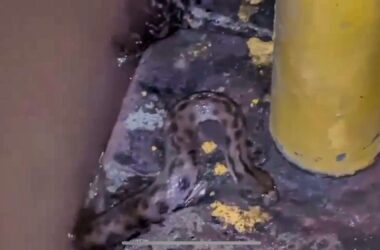 Uma serpente, aparentemente uma filhote de Sucuri (Eunectes murinus) foi vista próximo à régua de medição da Defesa Civil no rio Acre em Rio Branco,