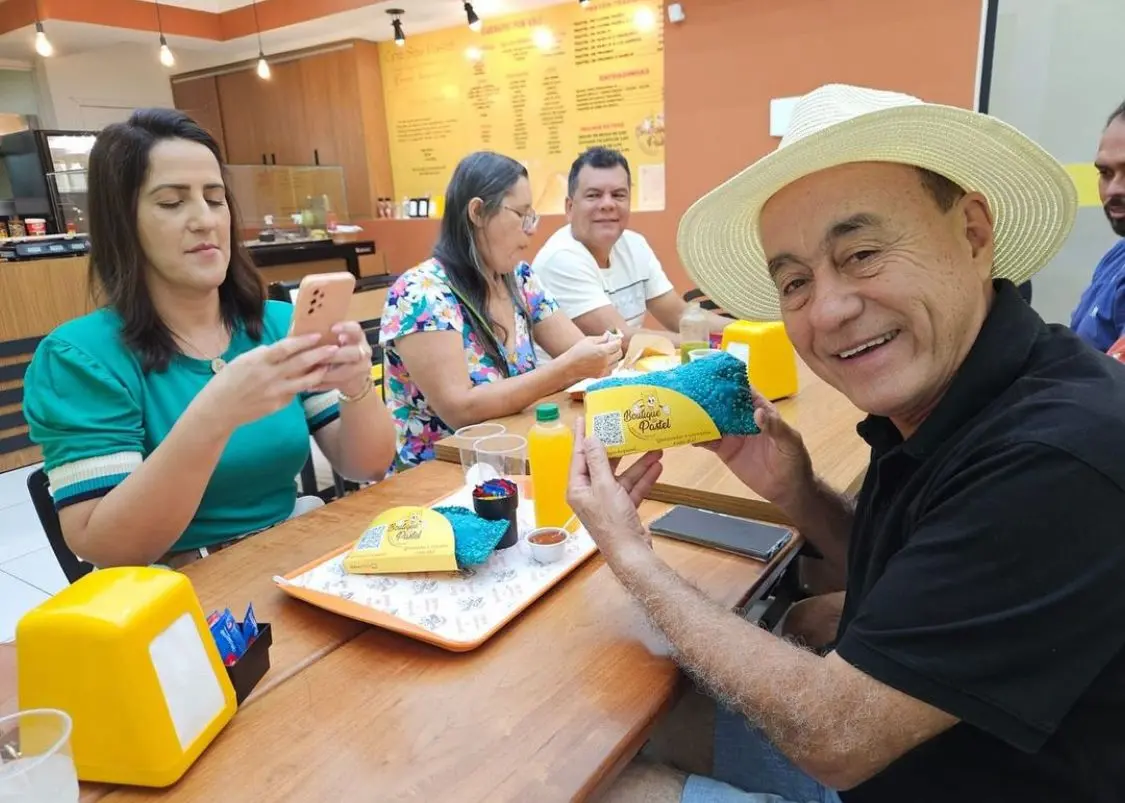 O prefeito de Rio Branco, Tião Bocalom, esteve neste sábado (13) em uma pastelaria ao lado da namorada, Kelen Rejane Nunes, e escolheu um pastel azul para saborear.