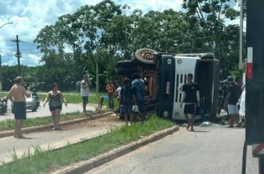 Um caminhão da Limpebrás, que atua na coleta de lixo em Rio Branco, tombou na manhã deste sábado (20), próximo a uma rotatória situada no