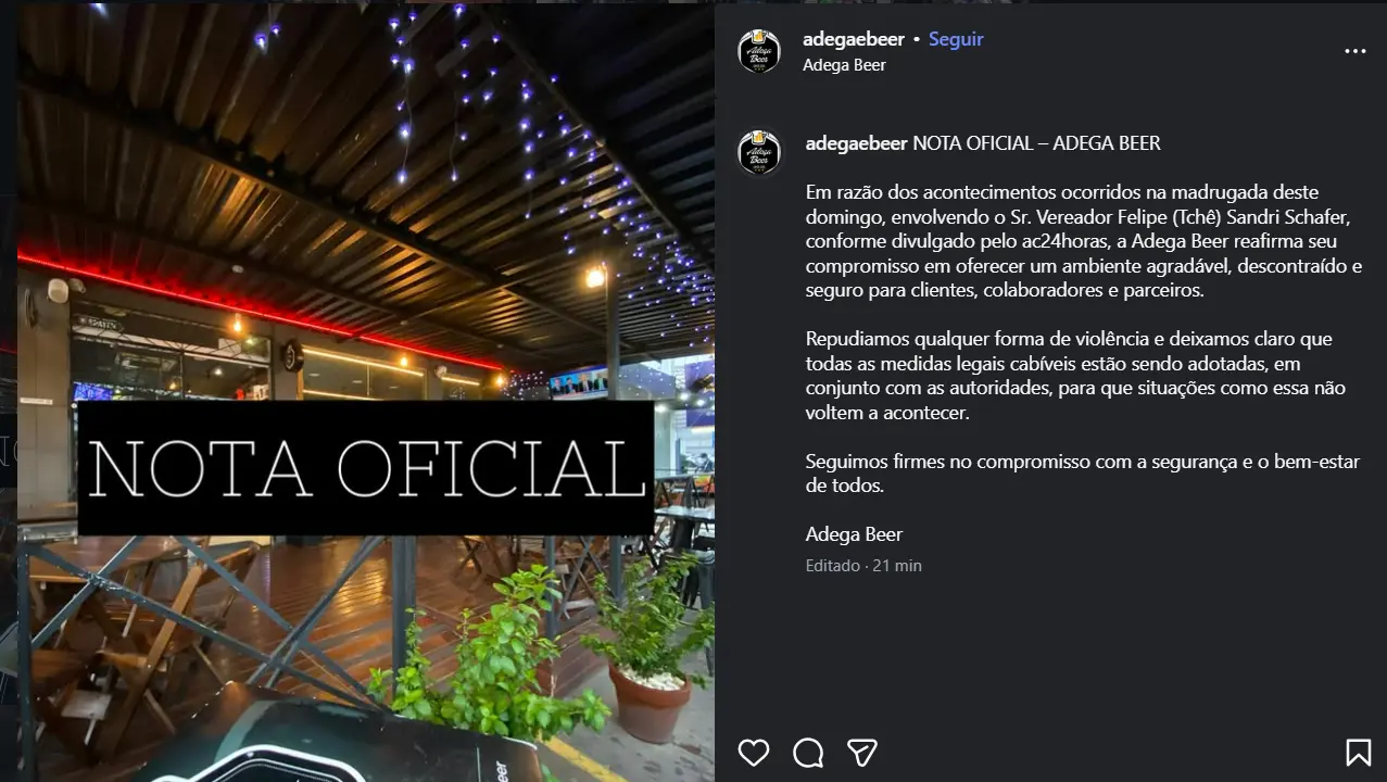 Dono de bar busca medidas legais após briga com vereador Felipe Tchê
