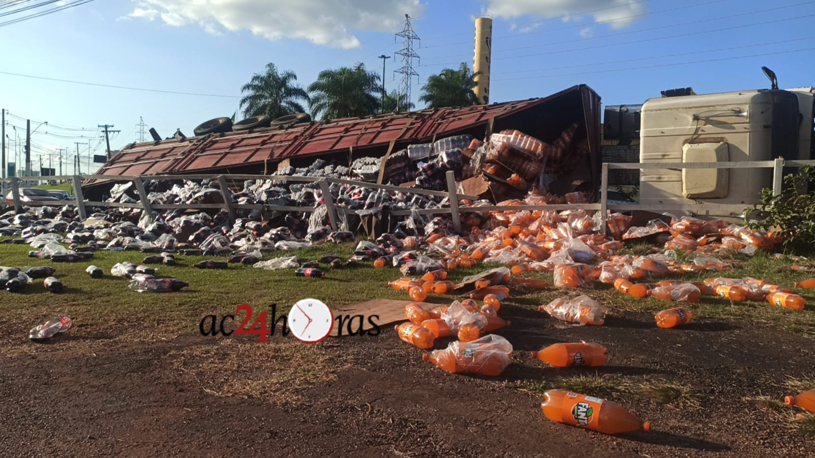 Uma carreta modelo Scania de uma empresa privada tombou com um carregamento de refrigerantes na tarde desta quarta-feira, 5, na rotatória em frente a Igreja Batista do Bosque, na Via Verde, em Rio Branco, e deixou o motorista Luan Araújo Maia, de 27 anos, machucado.