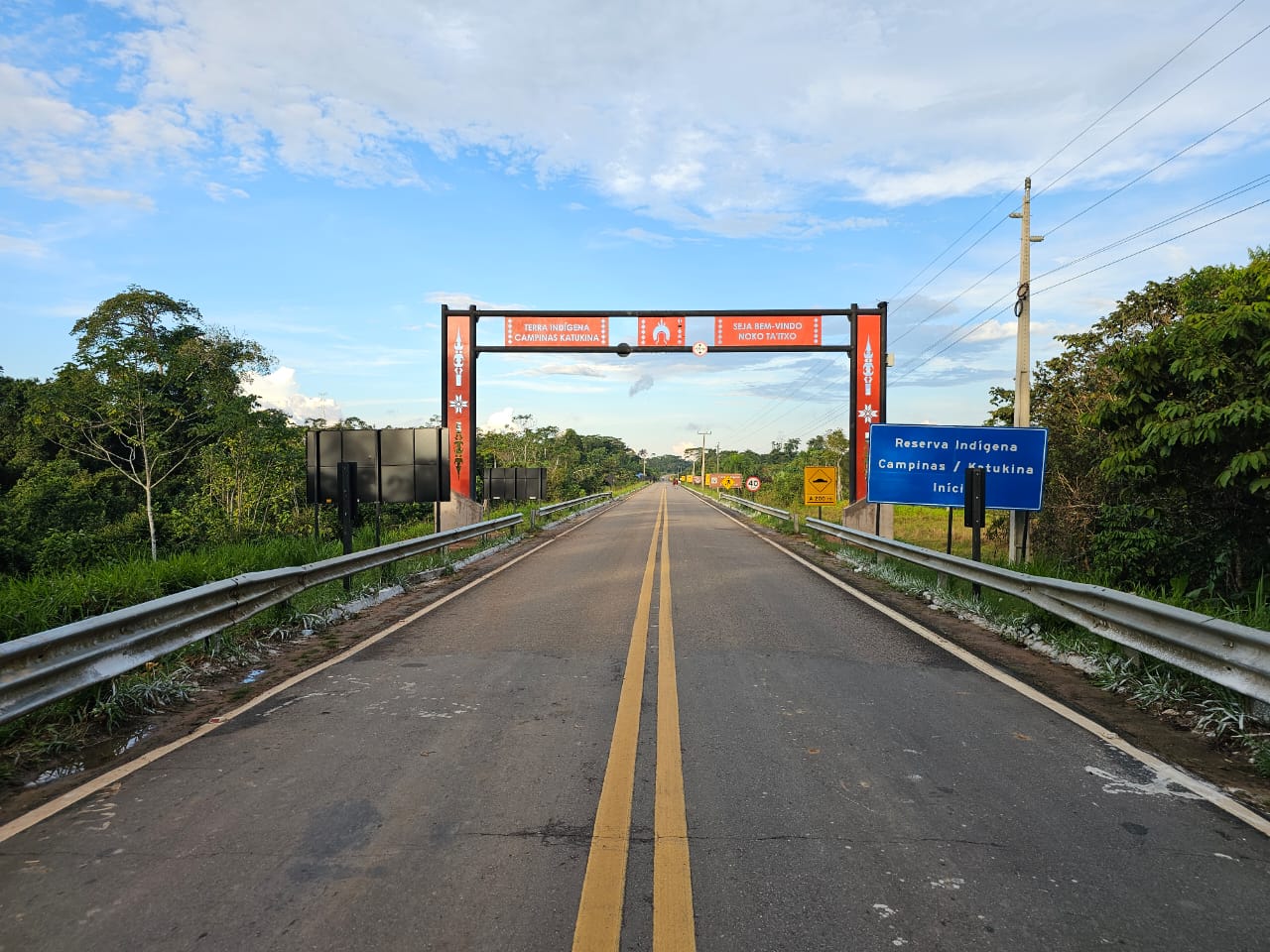 Dois pórticos que delimitam os 18 quilômetros da Terra Indígena dos Noke Koi, os Katukina, foram instalados nesse domingo, 16, na BR-364 pela empresa que liga o linhão de energia elétrica de Feijó a Cruzeiro do Sul. Os portais delimitaram em 5,50 metros a altura máxima para a passagem de veículos com cargas no trecho.