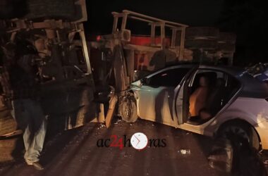 Um grave acidente de trânsito envolvendo uma carreta bitrem e um carro deixou quatro pessoas levemente feridas e interditou totalmente a BR-364, no km 24,