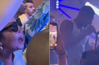 Mani Reggo, 41, foi flagrada curtindo uma apresentação do ex-namorado, Davi, 21, em um hotel em São Luís. Eles marcaram presença no São João da