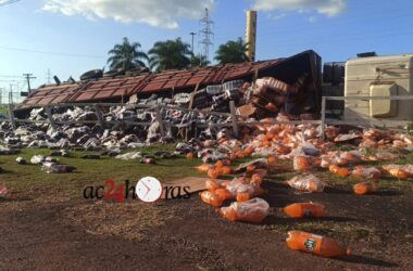 Uma carreta modelo Scania de uma empresa privada tombou com um carregamento de refrigerantes na tarde desta quarta-feira, 5, na rotatória em frente a Igreja