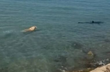 Um cachorro pulou no mar, perseguiu e deu uma leve mordida na cauda de um tubarão que estava bem próximo à areia de uma praia