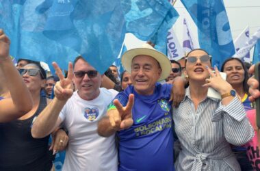 Acompanhado de sua namorada, a advogada Kelen Nunes, e do candidato a vice, Alysson Bestene, o prefeito Tião Bocalom (PL), candidato à reeleição, foi ovacionado