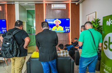 Assessores e apoiadores dos candidatos a prefeito de Rio Branco que participam do debate da TV Norte, afiliada SBT, acompanham a transmissão na recepção da