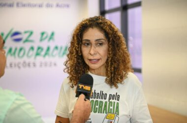 A diretora-geral do Tribunal Regional Eleitoral do Acre (TRE-AC), Rosana Magalhães, concedeu entrevista na sede do tribunal para abordar os preparativos para o pleito nos