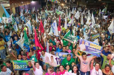 Uma multidão tomou a avenida Marinho Monte, em plena tarde de terça-feira, 03, para hipotecar apoio às candidaturas de Carlinhos do Pelado para prefeito e