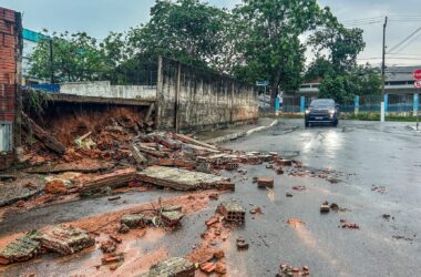 O temporal que atingiu Rio Branco na tarde desta quarta-feira (9) derrubou um muro na rua Carneiro Leão, no bairro Ivete Vargas. Segundo testemunhas, o