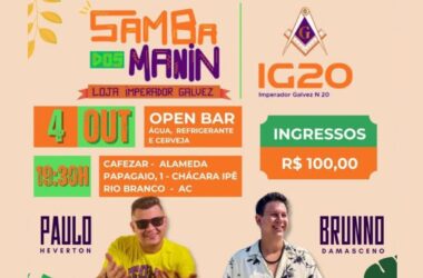 Os amantes do samba têm uma ótima opção na noite desta sexta-feira (4). A Loja Maçônica Imperador Galvez nº 20, realiza, a partir das 19