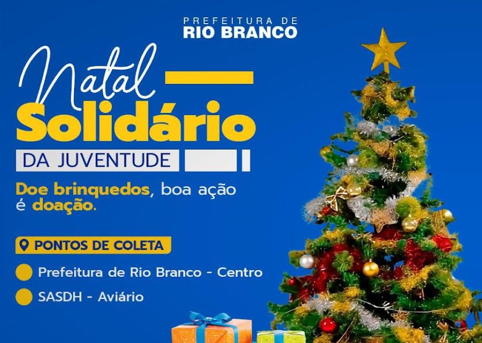 A arrecadação da “Natal Solidário da Juventude”, vai até dia 15 de dezembro, e os brinquedos podem ser entregues na sede da prefeitura, localizada na Centro de Rio Branco, ou na Secretaria de Assistência Social e Direitos Humanos, no Bairro do Aviário, em horário comercial.