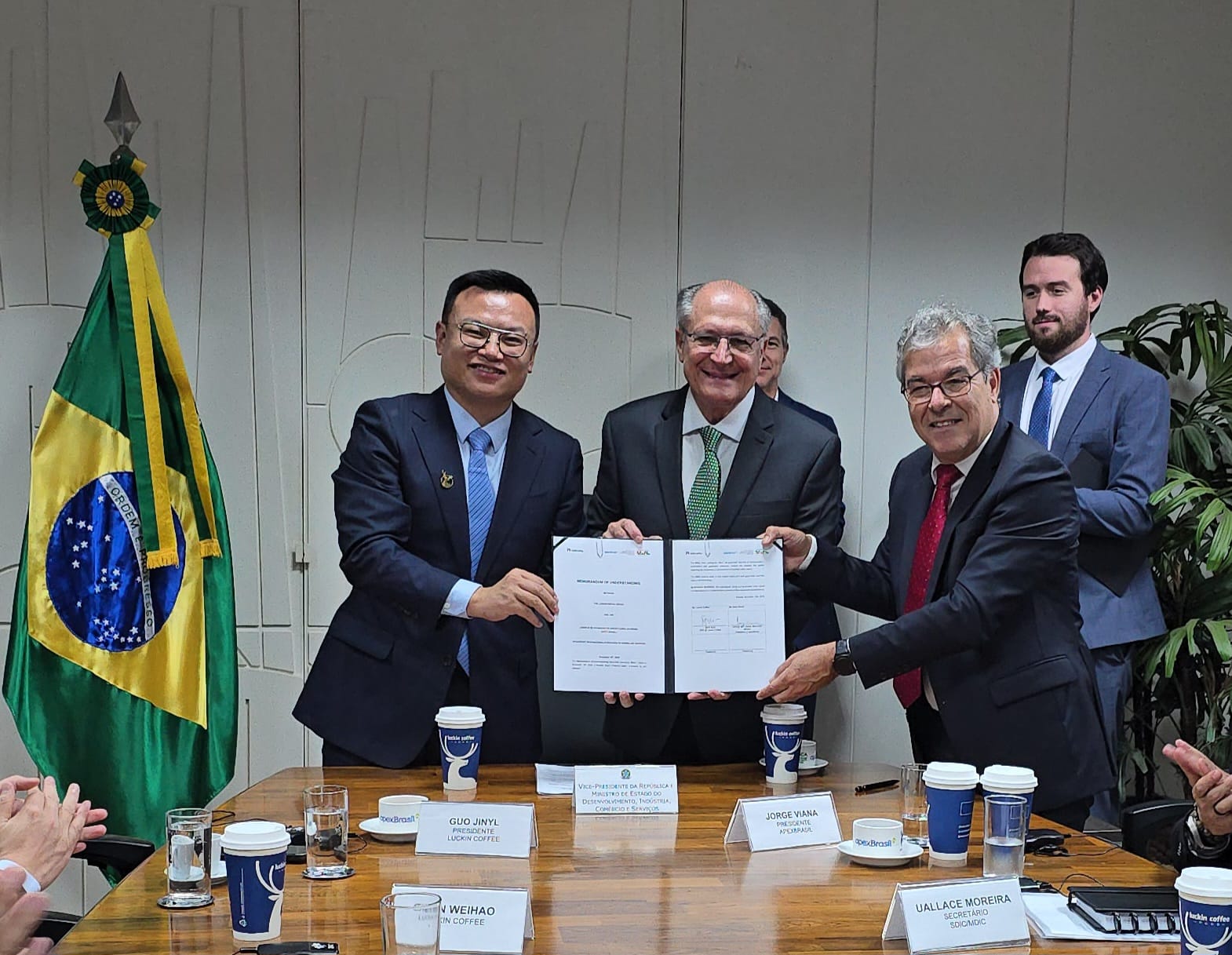 A exportação do café brasileiro ganhou um novo impulso com a assinatura de um Memorando de Entendimento entre a ApexBrasil e a Luckin Coffee, a maior rede de cafeterias da China. O acordo foi firmado nesta terça-feira, 19, pelo presidente da Agência Brasileira de Exportações (ApexBrasil), Jorge Viana, pelo vice-presidente da República e ministro Geraldo Alckmin, e pelo CEO da Luckin Coffee, Guo Jinyi.