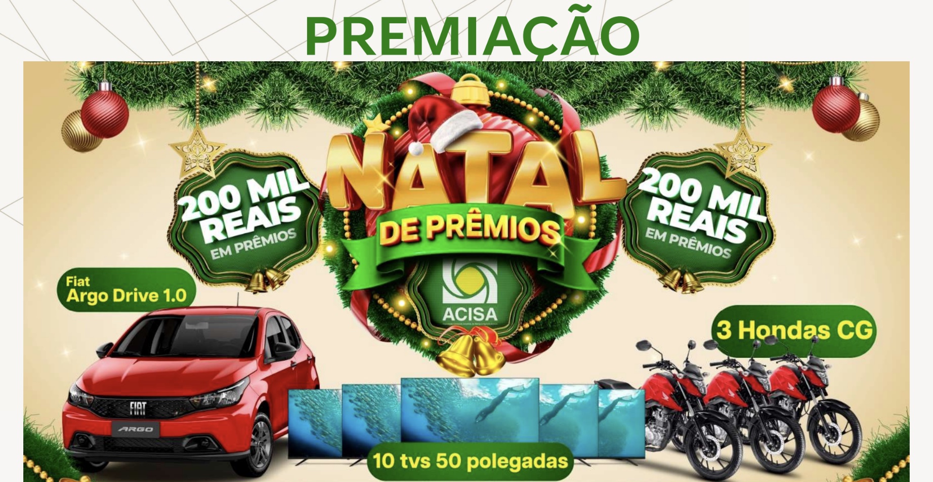 A Associação Comercial, Industrial, de Serviço e Agrícola do Acre (ACISA) oficializou nesta terça-feira, 26, o lançamento da campanha Natal Premiado, uma das maiores ações promocionais de final de ano em Rio Branco (AC). Com prêmios que incluem 10 TVs de 50 polegadas, três motos Honda CG 160 e um Fiat Argo 1.0, a campanha promete aquecer as vendas no varejo e atrair clientes em grande número.