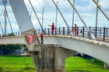 Cabos de aço estão sendo instalados durante as obras de recuperação estrutural da Passarela Joaquim Macedo, no centro de Rio Branco, região do Novo Mercado