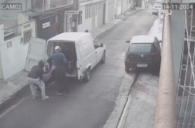 Três homens foram ‘pegos no flagra’ por câmeras de segurança enquanto furtavam uma motocicleta que estava estacionada em uma calçada, e a colocavam dentro de