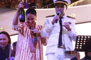 Vestido de capitão, ao lado da sua esposa Graciele Lacerda, Zezé Di Camargo embarca em seu navio neste sábado, 16 de novembro, no Porto de