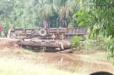 Um caminhão que transportava gado tombou em uma ponte do ramal do Canarai, na zona rural do município de Rodrigues Alves, nessa quinta-feira, 28. De
