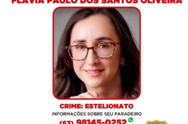 Polícia Civil do Tocantins divulgou nesta terça-feira (17) um cartaz de procurada da advogada Flávia Paulo dos Santos Oliveira Ribeiro, suspeita de aplicar golpes financeiros
