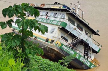 A Unidade Básica de Saúde (UBS) fluvial de Rodrigues Alves, que fica ancorada na comunidade Agrovila do Muju, amanheceu neste sábado, 7, parcialmente submersa no