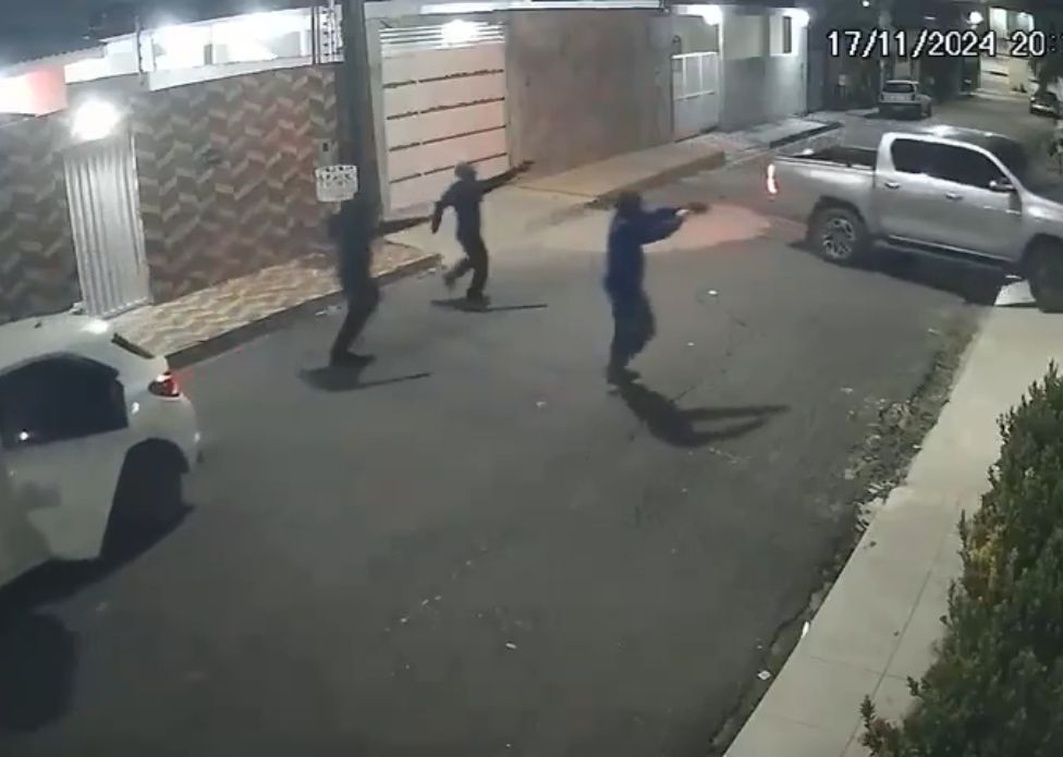 Câmeras de segurança registraram o momento em que três criminosos fortemente armados assaltaram uma família, no dia 17 de novembro de 2024, na rua Jerusalém, bairro Cidade de Deus, zona norte de Manaus.