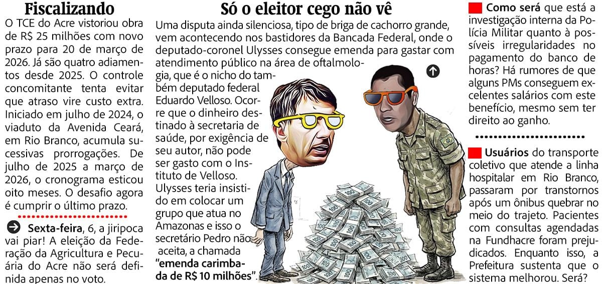 Sobre o futuro do Adjunto da Educação, a coluna tem uma sugestão. Já que Machado é especialista em “leva e traz”, Bocalom poderia colocá-lo para ajudar a nora de Marcio Bittar na Semeia. Para ficar enredando à secretária quem é que fica jogando lixo em beira da estrada e fazendo valer a lei aos infratores.