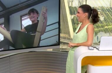 Sabina Simonato, Guilherme Pimentel e Cinthia Toledo não seguraram a risada após a resposta inusitada de uma criança durante o Bom Dia São Paulo desta