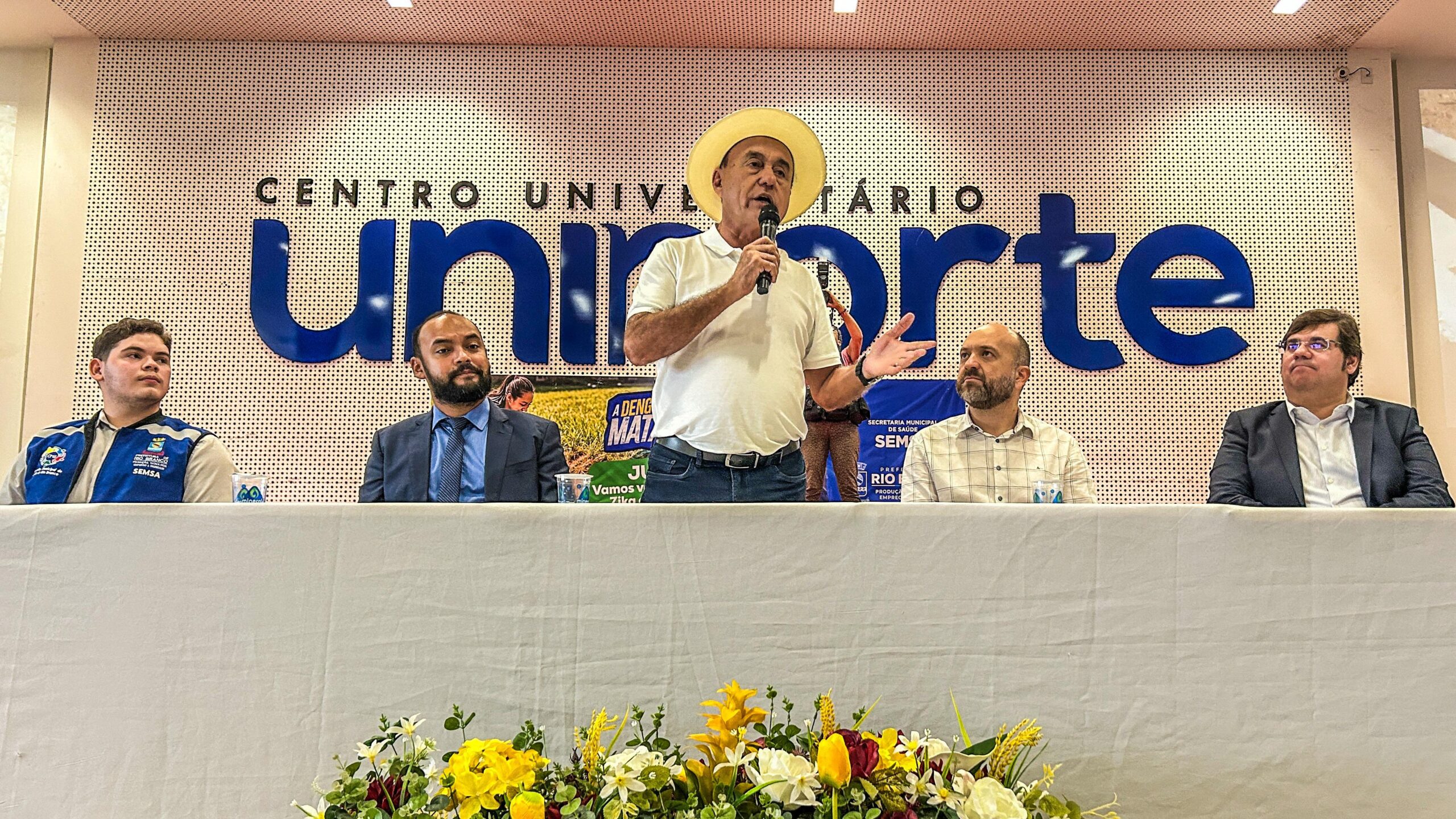 Em um esforço conjunto para enfrentar o crescente número de casos de dengue e outras arboviroses, a Prefeitura de Rio Branco realizou nesta quarta-feira, 19, uma cerimônia de contratação emergencial e apresentação do pacote de ações voltadas ao combate dessas doenças. O evento, realizado no auditório da Uninorte, no bairro Jardim Europa, contou com a presença de autoridades municipais e estaduais, além de profissionais de saúde e representantes da população.