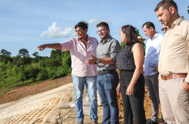 O governador Gladson Cameli, a vice-governadora Mailza Assis e o presidente da Aleac, deputado Nicolau Júnior, estiveram em Brasileia para acompanhar o andamento das obras